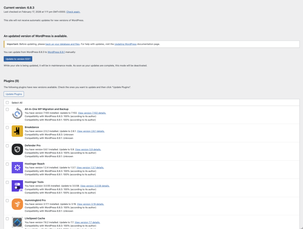 This is number one for a reason. The vast majority of hacked WordPress sites are running outdated software, whether that’s WordPress core, plugins, or themes.