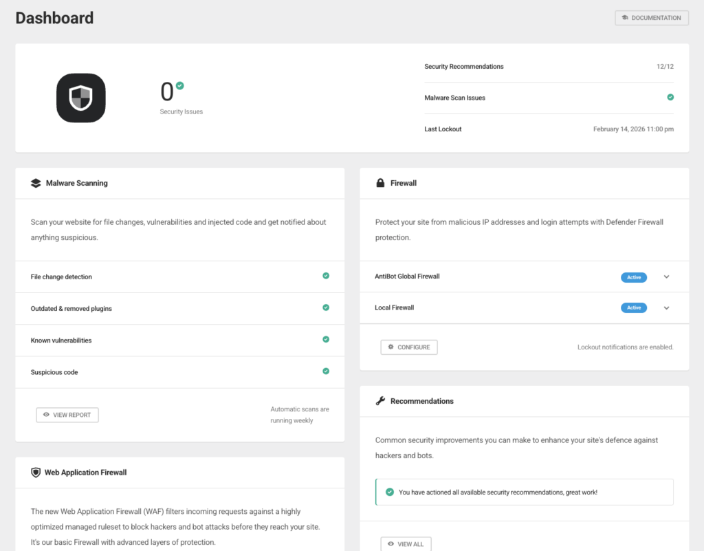 I use Defender Pro from WPMU DEV across all our Gecko sites. It handles malware scanning, firewall rules, login protection, two-factor authentication, and security recommendations, all from one plugin.