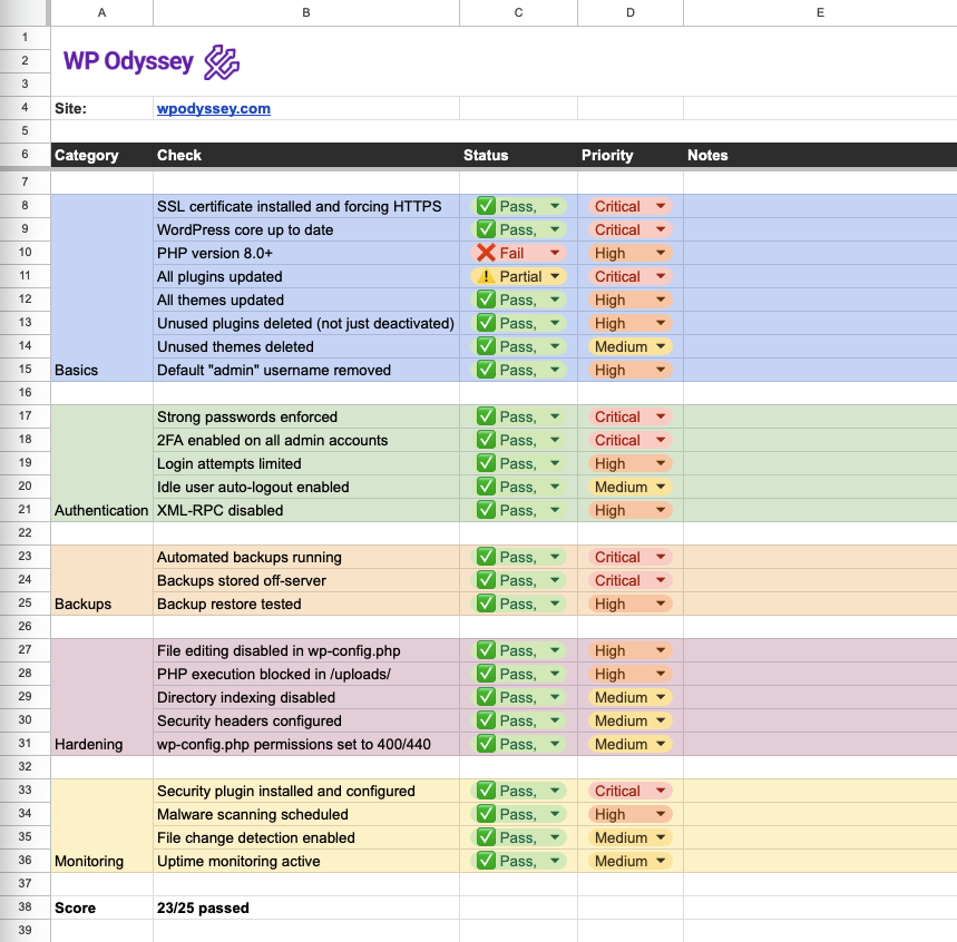 I’ve turned this guide into a free Google Sheet template you can use to audit your own sites. Grab it inside the WP Odyssey community – it’s free to join.
